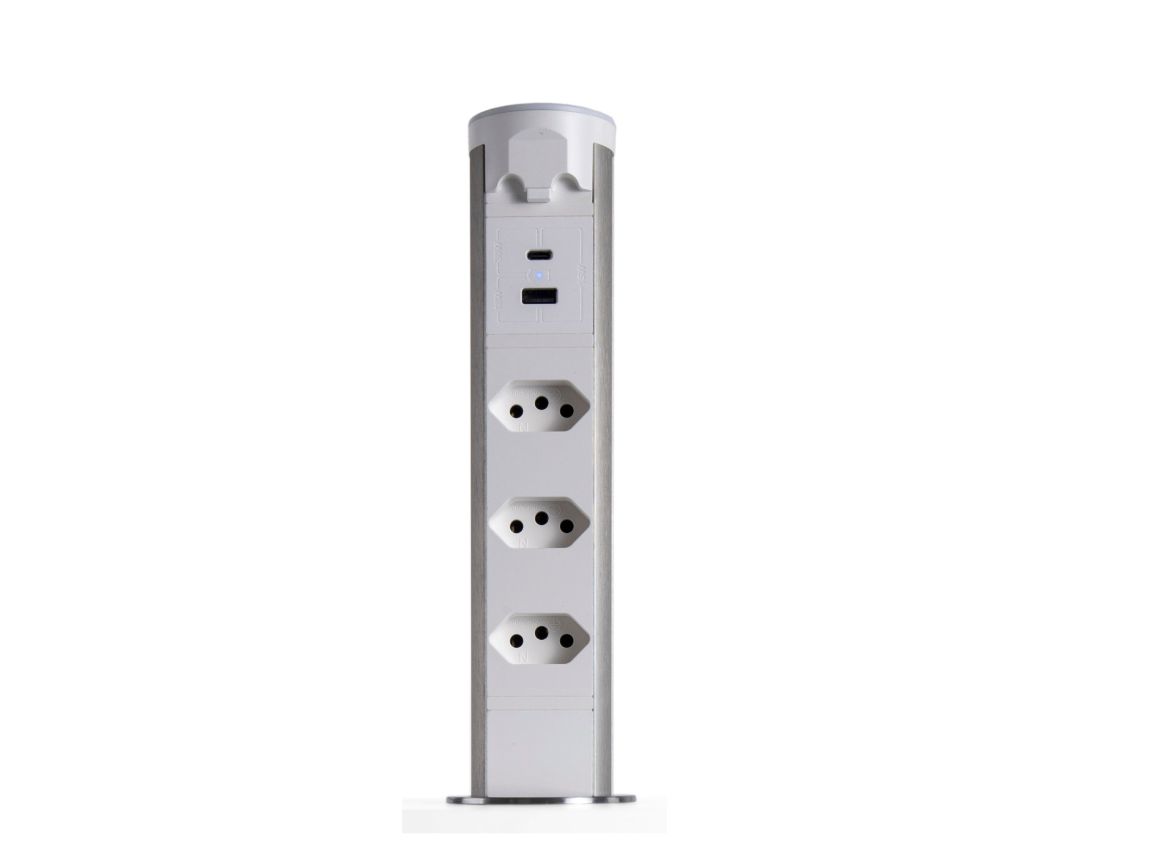 Torre motorizada Small Branca com Prata da QTMOV Publicado 2 de setembro de 2025 às 1152 × 864 em Torre de Tomada Motorizada Small — 3 tomadas, 2 USBs (A+C) e indução – Sem Indução, Branco